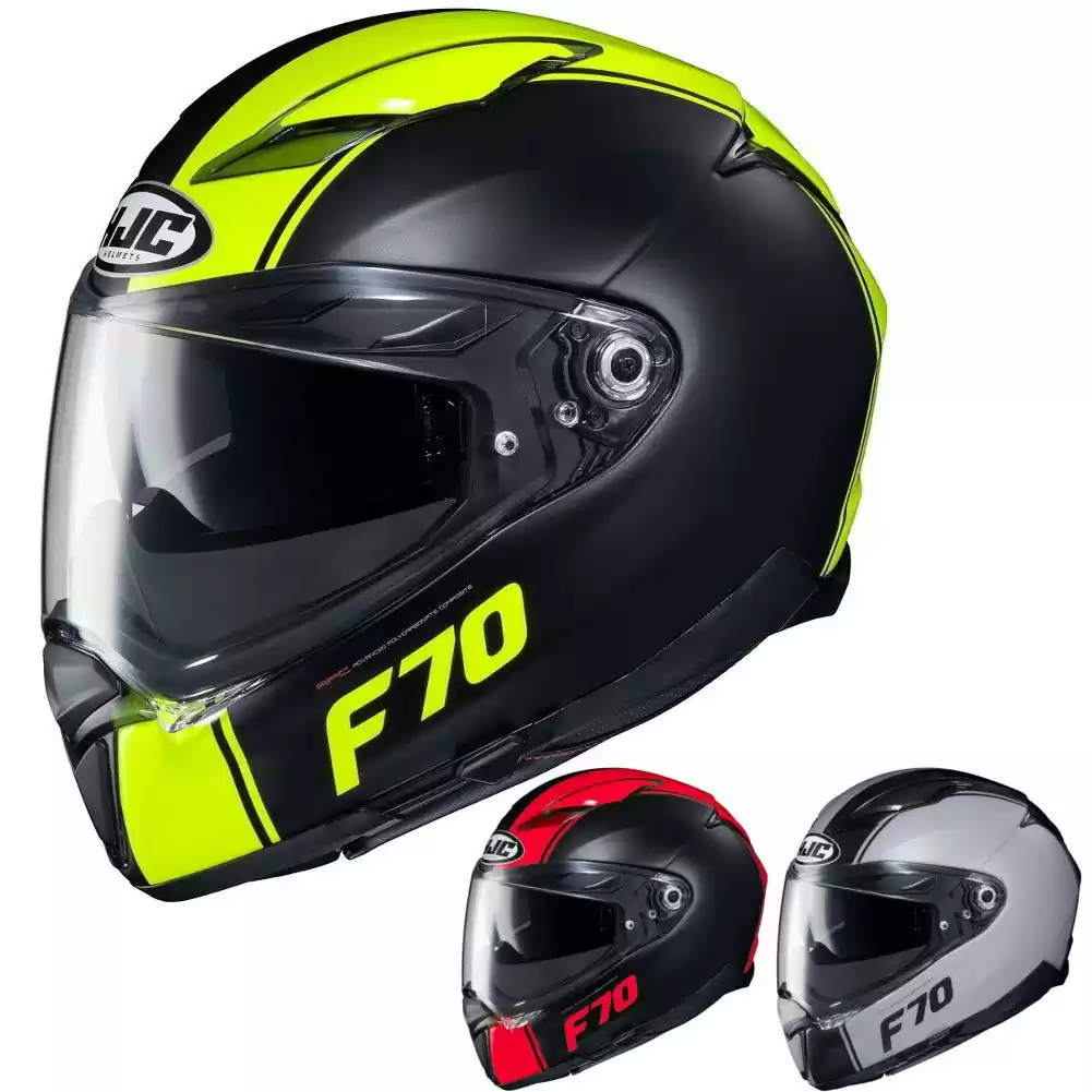The HJC F70 Helmet brings technical design and materials at an affordable price point. Its aerodynamic shell is made out of fiberglass composite for a lightweight yet stiff exterior. HJC’s Advanced Channeling Ventilation System (ACS) helps move air through the helmet and pull heat and moisture out. Anti-bacterial fabric lining the interior wicks sweat away and dries quickly. Emergency quick release cheek pads are a welcome feature, usually reserved for more expensive track day helmets. An integrated drop down internal sun visor makes it easy to manage the sun without having to worry about bringing an extra face shield along. Speaker pockets allow the F70 Helmet to more easily take a bluetooth communication system. A breathe deflector and chin curtain are included from the factory, just a few of the details that HJC has considered.Â
